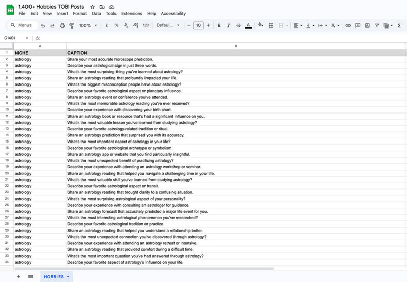 FREE Spreadsheet – 1,400+ Hobbies Niche TOBI Posts